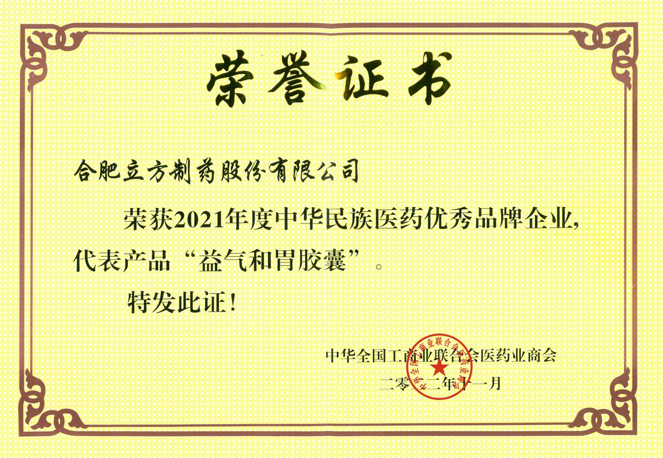 2021年度中華民族醫(yī)藥優(yōu)秀品牌企業(yè)