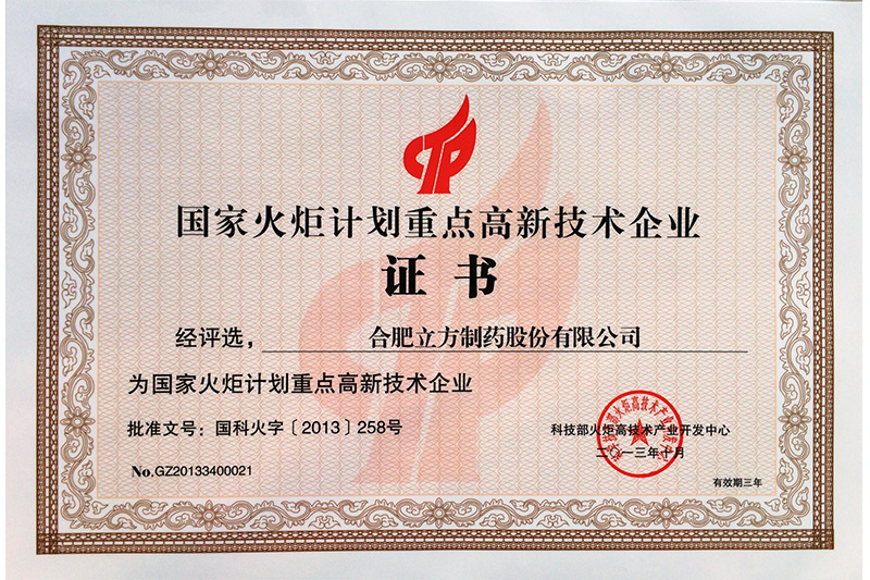 立方制藥 國家火炬計劃重點高新技術(shù)企業(yè)證...